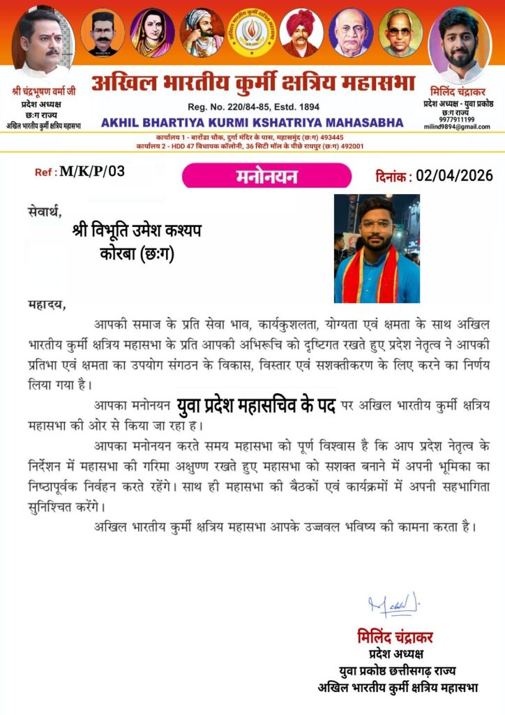 अखिल भारतीय कुर्मी क्षत्रिय महासभा के संगठन विस्तार की दिशा में एक महत्वपूर्ण निर्णय लेते हुए युवा प्रकोष्ठ की कमान युवा नेतृत्व को सौंपी गई है। महासभा के छत्तीसगढ़ प्रदेश अध्यक्ष चंद्रभूषण वर्मा की अनुशंसा पर युवा प्रकोष्ठ के प्रदेश अध्यक्ष मिलिंद चंद्राकर ने विभूति कश्यप (विभु) को ‘प्रदेश महासचिव’ के महत्वपूर्ण पद पर नियुक्त किया है।