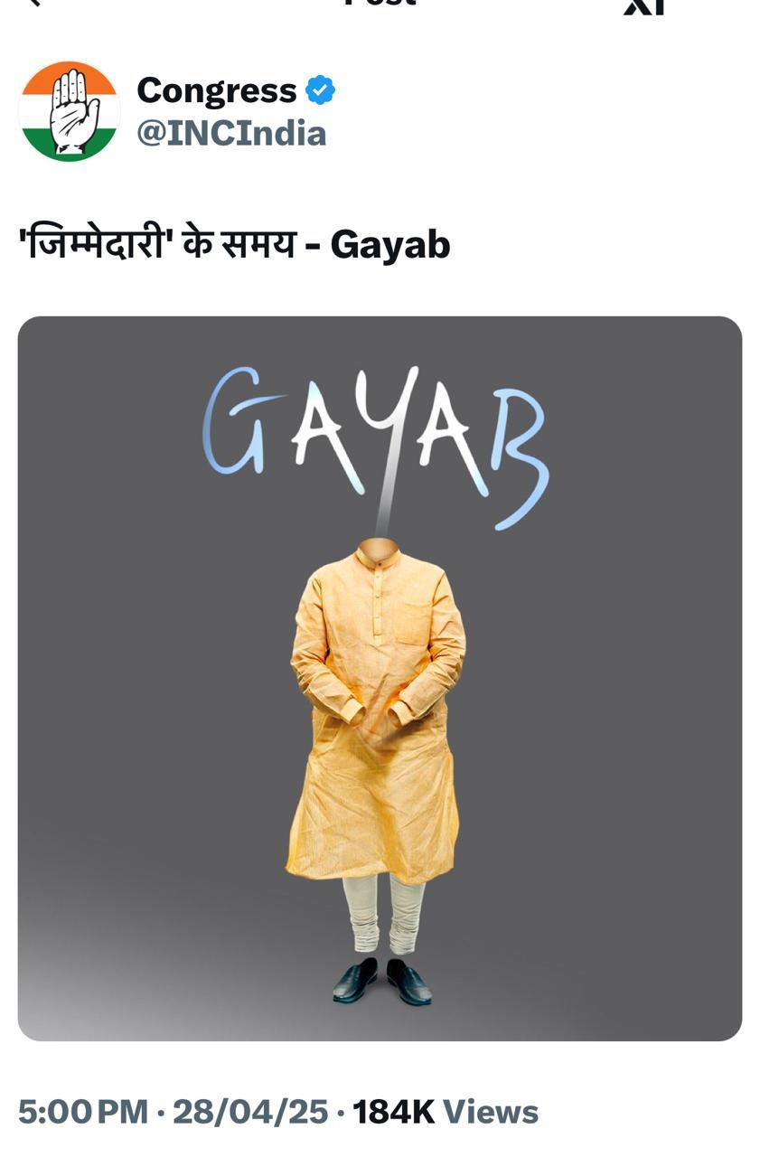 नई दिल्ली: कांग्रेस ने हाल ही में प्रधानमंत्री नरेंद्र मोदी पर अप्रत्यक्ष रूप से किए गए एक विवादित पोस्ट को अपने आधिकारिक एक्स (पूर्व ट्विटर) अकाउंट से हटा लिया है। इस पोस्ट में एक व्यक्ति की तस्वीर थी, जिसमें सिर की जगह “गायब” लिखा हुआ था। माना जा रहा है कि यह पोस्ट पीएम मोदी के संदर्भ में किया गया था, जिसे लेकर राजनीतिक गलियारों में तीखी प्रतिक्रियाएं सामने आई हैं।