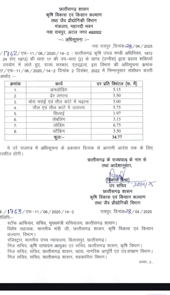 छत्तीसगढ़ कृषि मंडी विभाग द्वारा जारी निर्देशों के अनुसार, मंडी में कार्यरत हमालों को धान खाली करने, स्टैकिंग, छल्ली लगाने, सिलाई सहित समस्त कार्यों के लिए ₹34.77 प्रति क्विंटल की दर से भुगतान किया जाना निर्धारित है।