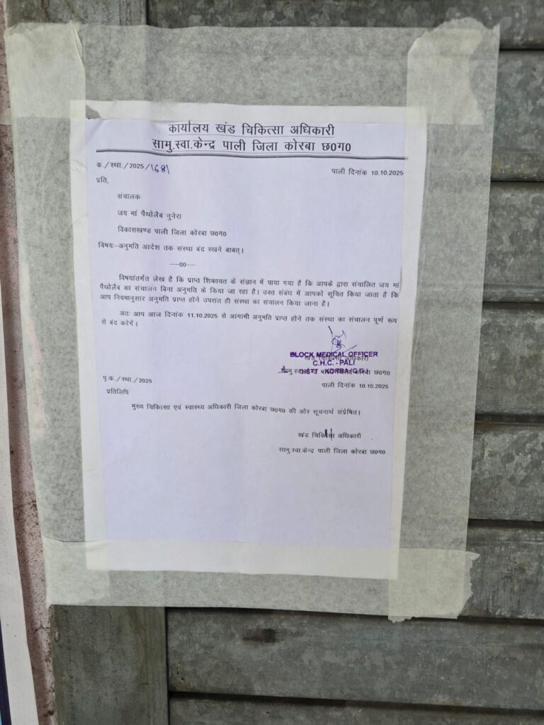 जब खंड चिकित्सा अधिकारी ने संचालक से लाइसेंस संबंधी दस्तावेज मांगे तो उसने दीपका में संचालित संस्था का लाइसेंस प्रस्तुत किया, जबकि नुनेरा में संचालित इस लैब का कोई वैध लाइसेंस उपलब्ध नहीं था।