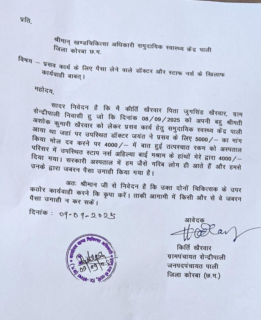 ग्राम सेंदरीपाली निवासी पीड़ित कीर्ति सिंह खैरवार ने बताया कि दिनांक 08 सितंबर 2025 को वह अपनी बहू अशोक कुमारी खैरवार को प्रसव हेतु अस्पताल लेकर आए थे। इस दौरान अस्पताल में पदस्थ डॉक्टर ने 5 हजार रुपये की मांग की और मोलभाव के बाद 4 हजार रुपये में सहमति बनी। यह रकम अस्पताल परिसर में पदस्थ स्टाफ नर्स को दी गई। परिजन ने स्पष्ट कहा कि यह सरकारी अस्पताल गरीबों की सेवा के लिए है, लेकिन यहां खुलेआम जबरन वसूली हो रही है।