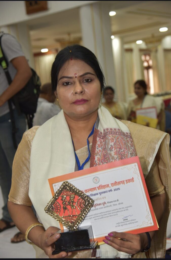 विगत दिनों शिक्षिका मधुलिका दूबे को कला कौशल को शिक्षा के क्षेत्र में नवाचार के रूप में उपयोगी बनाने के लिए राजभवन में राज्यपाल महामहिम रमेन डेका जी के हाथों राज्यपाल पुरुष्कार से सम्मानित हुई।शिक्षिका मधुलिका दूबे एक नवाचारी शिक्षिका के साथ छायावादी कवियत्री भी हैं.।शिक्षिका को पहले भी उनकी अद्वितीय प्रतिभा के लिए अनेक मंचो से सम्मानित किया जा चूका है।