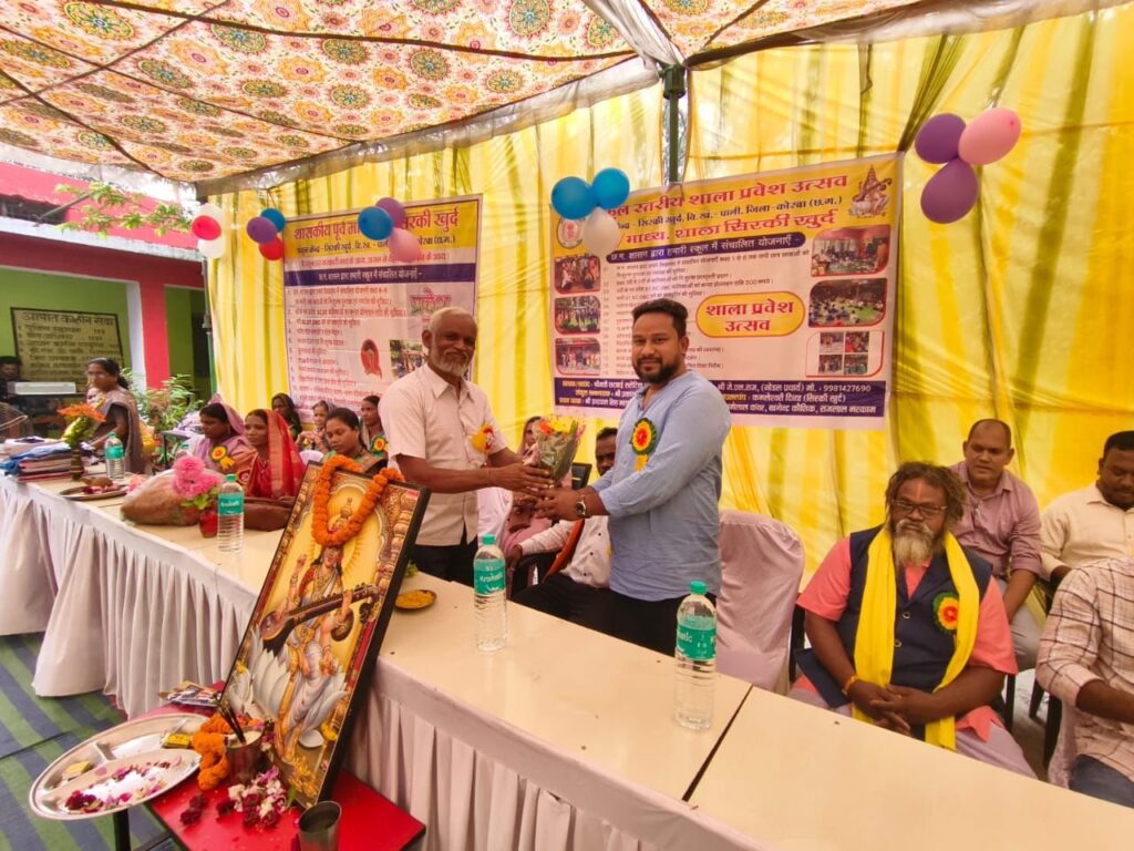 नवप्रवेशी बच्चों का विशेष रूप से गुलाल लगाकर व माला पहनाकर अभिनंदन किया गया एवं उन्हें गणवेश और पाठ्यपुस्तकें वितरित की गईं।